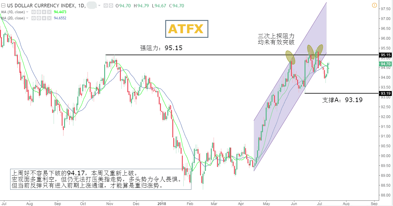 日线级别已经跌破上升通道,当前反弹虽力度较强,但尚未突破95.15,仍只定义为回踩。贸易战不被市场解读为利空消息,这是最大的错误。因为提高关税势必打压相关产业利润,进而造成企业或者不招工或者裁员,未来失业率节节攀升,将成为美指的持续性利空。