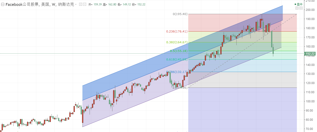 纳斯达克的下跌,主要受到脸书的影响,所以我们对脸书股价走势图进行标注分析。周线级别,目前回撤幅度占据前一上涨波段的50%,目前报价152.22美元每股。市价刚刚触及上升通道线下轨,目前还不能确定是否有效突破。