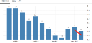 最新值为1.8%,低于前值2%,预示美国经济将步入衰退通道。美联储进行货币政策决策时,也较为倚重CPI表现情况。虽然在最新一次利率决议当中并没有采取降息举措,但点阵图已经预示FOMC内7位票委希望2019年降息两次。美联储主席鲍威尔近期讲话也显示出其对于美国经济和中美贸易摩擦的担忧。