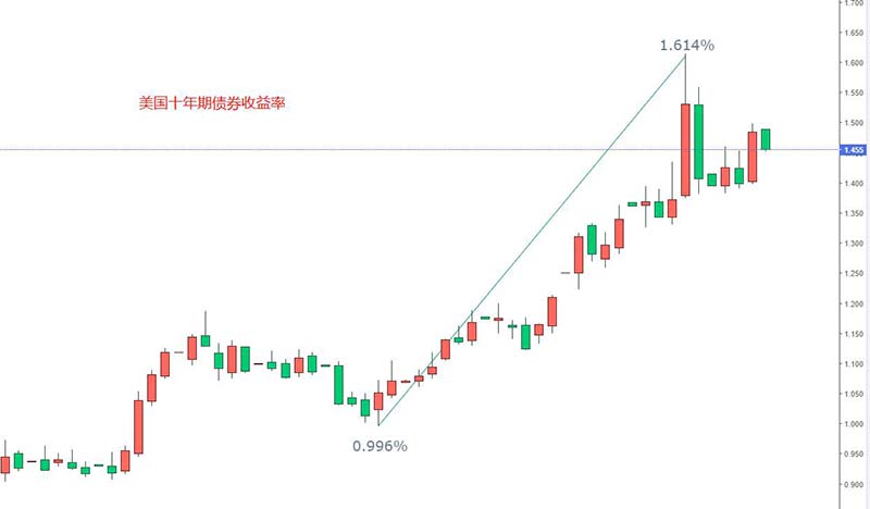 十年期美债收益率是更加敏感的指标,即便M2增速和美国劳动力市场没有出现大的改观,只要美债收益率不断上行,就意味着市场上的避险情绪大幅减退。近期美债达到的最高收益率水平为1.614%,而美国当前的基准利率为0.25% 。要知道,2020年3月份美国疫情爆发的初期,十年期美债的收益率跌至了0.318%,而当时的美国基准利率也是0.25% 。一年过去了,债券收益率翻了五倍,而美国基准利率纹丝未动,这是不合理的。投资者可以拭目以待美联储未来的货币政策,看其如何扭转这种利率双轨的局面。