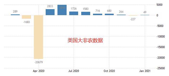 好消息是,美国的失业率正在不断走低,从2020年四月份开始的14.8%,降低至2021年1月份的6.3% 。国际通用的健康失业率标准是5%,从这个角度来看,美国的失业率还有很大的改善空间。本次大非农,市场预期公布值将与前值相同,也就是说,从大的角度来看,美国的新增失业人口和新增就业人口,数量基本一致。