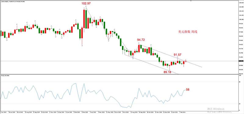 美元指数的周线级别处于底部震荡状态,未来走势将沿着图中通道线运行。美国国会已经通过了1.9万亿美元的紧急救助计划,代表市场上的美元还将会越来越多。同时,美联储还没有加息和缩减资产负债表的计划,依旧在执行疫情期间的“印钞模式”。但是,在供应不断加码时,美元指数还能维持住震荡走势,没有一泻千里,这代表投资者非常看好美国的经济复苏进程(也就是需求面同样在增长的预期)。可惜的是,还没有什么证据能够证明这种复苏,除了不断减少的新增确诊病例总数。一个逻辑上的信号是,某一个月的美国大非农新增就业人数出现超过100万人的增加,或者美国的CPI增幅稳定在2%之上。笔者的看法,美国最危险的时候已经过去,美元指数的主体下跌波段也已经结束。美元的升值周期将在不远的将来变为现实。
