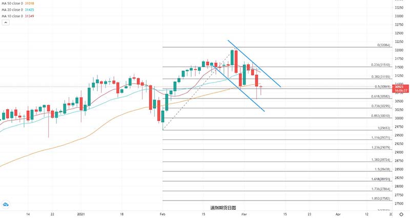 道指期货昨日曾录得2月份以来最低位,不过守在短期下行通道内部,日图关键均线已经全部转为阻力,所以留意可能继续向下测试昨日低点30551,特别是当今晚非农如果特别令人失望,可能进一步向30295靠近。如果非农意外超预期,展望价格重返50均线的31000上方后看向31155阻力,但即便非农靓丽,道指进一步上行可能会遭遇20日均线和通道顶部带来的阻力,也就是在31500附近。