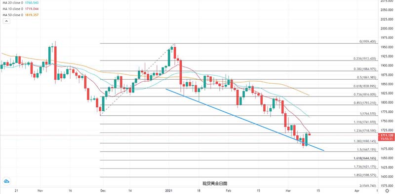技术上看金价昨日一度跌破自1月以来的下行趋势线支撑后反弹,今早尝试测试10日均线阻力1719附近,不过还没有进展,所以应留意1690的支撑,特别是今晚CPI公布后如果超预期,金价或再次跌破趋势线后下望1667美元。上行方面,如果突破本周高位将以1742美元为目标,但要进一步上望1764美元高位有难度。