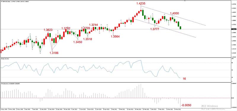 综合判断:当前处于下跌波段,预计将会在通道线下沿获得支撑,点位在1.3586附近。