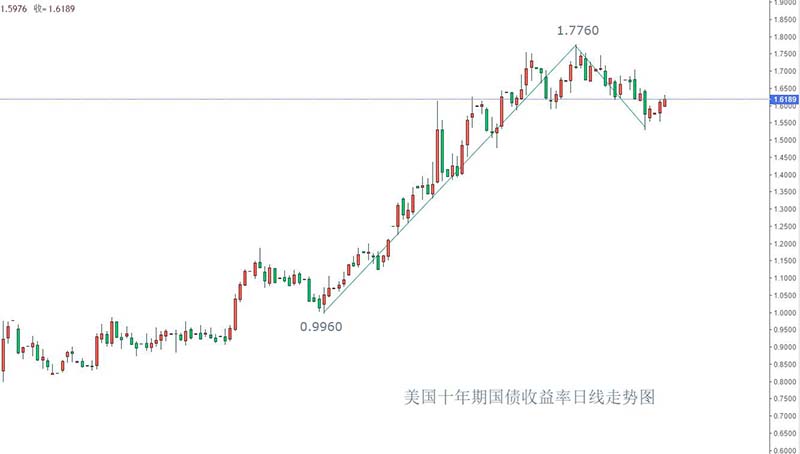 技术角度来看,美债收益率近期仅仅是前期大幅上涨之后的适度回调,且回调幅度低于50%,没有趋势转折的特征。最近四个交易日,美债收益率均收出阳线,从最低点1.5280%上涨至1.6260%,这意味着本周的EURUSD大涨(1.2078的高位)没有任何依据,属于市场情绪不稳定造成的。美联储当前的基准利率区间为(0~0.25%),而国债收益率的最新值为1.6%,后者远高于前者,美联储存在加息的压力。