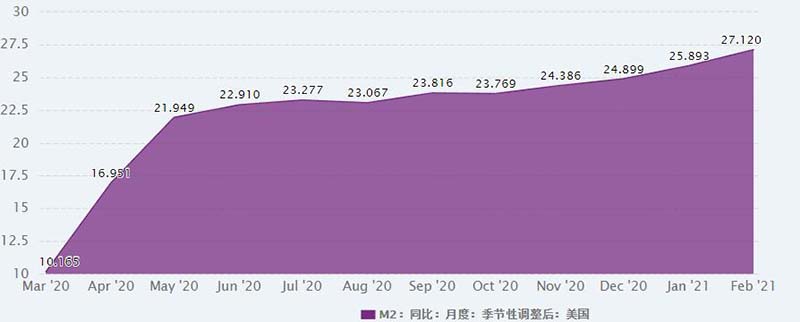 说实话,对于美国M2增速的判断,笔者出现了重大失误。从上图可以看出,2月份美国M2增速为27.12,而1月份的M2增速为25.89%,今年以来处于增速提高的状态。但是,笔者在年初的判断是美国的M2增速会随着辉瑞疫苗的普遍接种,而不断降低。现在看来,这一结论明显错误。疏忽的地方在于,美联储完全不在意市场的美元总量不断放大,根本不考虑加息和缩减资产负债表的政策。要知道,美联储开动印钞机,买单的是全世界各国的外汇储备。只降息不加息,说的严重一点,属于央行层面的耍流氓。