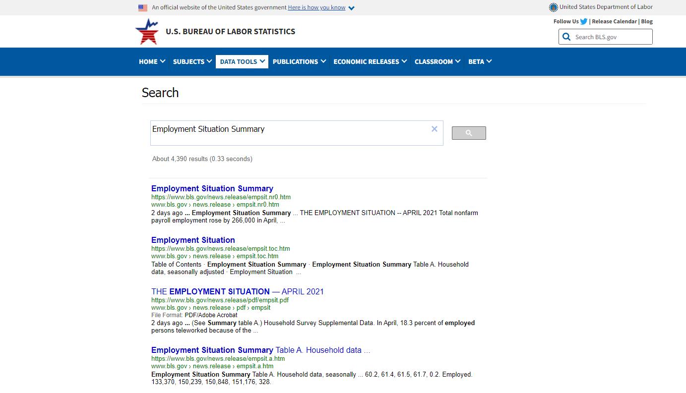 在劳工统计局官网的右上角,有站内搜索功能。只需要在搜索框内输入:Employment Situation Summary,点击搜索,会出现如下图界面: