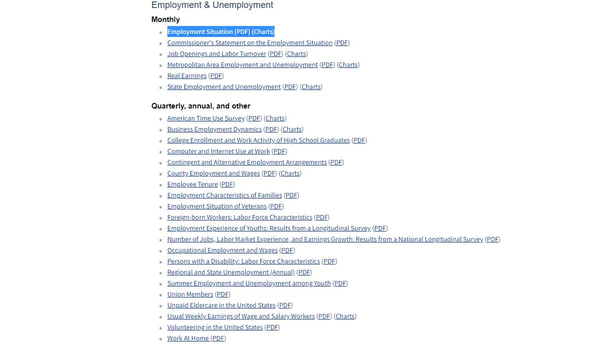 找到官网首页的顶部菜单栏,其中有一项菜单叫做“ECONOMIC RELEASES”。鼠标左键点击后,会出现下拉菜单,在下拉菜单中找到“Employment & Unemployment ”,鼠标左键点击。之后会出现一个新的页面,该页面顶部就会显示我们需要的“就业形势”超链接,名称为“Employment Situation (PDF) (Charts)”,鼠标左键点击该超链接,即可直接进入最新一期非农就业报告的内容页面,如下图: