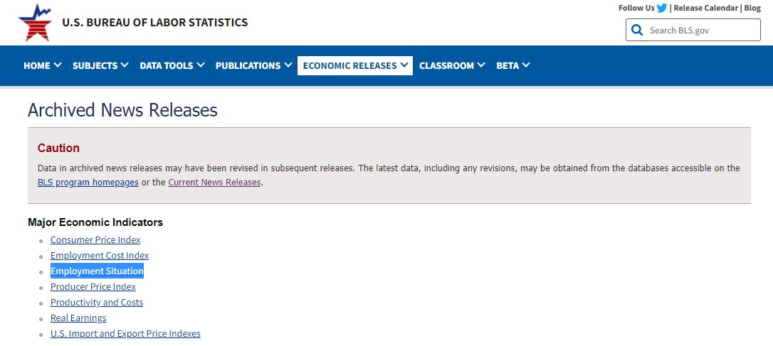 同样是劳工统计局首页菜单栏的“ECONOMIC RELEASES”选项,鼠标左键点击呼出下拉菜单,在下拉菜单中找到“Archived News Releases>>”选项,鼠标左键点击该选项。在出现的新页面中找到就业形势的英文名称“Employment Situation”,鼠标左键点击,如下图: