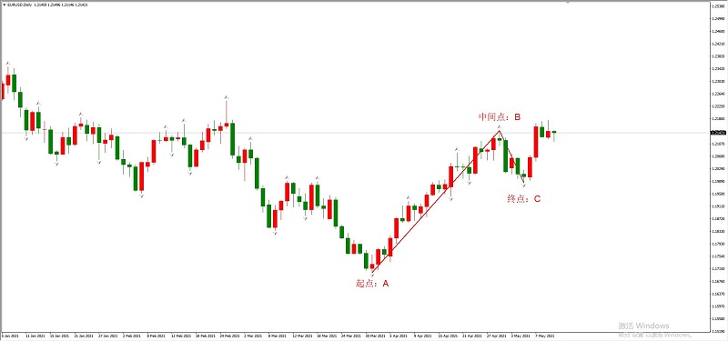 对于勾形理论来说,速率线不是用在单一波段之上,而是勾形结构之上。勾形结构实际上是两个方向相反的波段的连接,这样会天然出现三个关键点:起点A、中间点B、终点C。如下图: