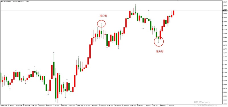 重要的阻力支撑位,笔者习惯使用分形指标来进行确认。有些人也会将分形指标叫做分型指标,后者来源于缠论。笔者所谓的分形与缠论的分型在K线数量要求上有所不同,所以命名上也有所差异。缠论讲分型指标由三根K线构成,笔者所讲分形指标由五根K线构成。如下图: