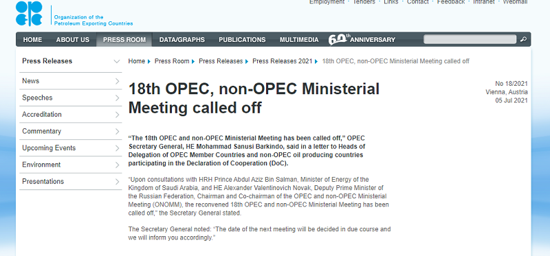 OPEC官方网站发布声明:第18届OPEC+部长级会议在延期至7月5日之后,宣布彻底取消,下一次部长级会议举办时间另行通知。