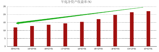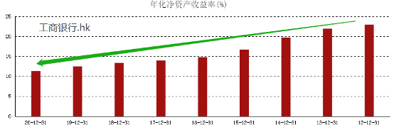 横向比较来看,香港上市的银行股ROE基本都处在10%左右。建设银行2020年ROE为11.83%,为上表汇总的银行股中最高。汇丰控股较为特殊,2020年ROE只有2.04%,并且连续多年都在这一水平。其余银行股的ROE柱状线与建设银行基本相同,都处于稳定的下行状态。以工商银行为,见下图: