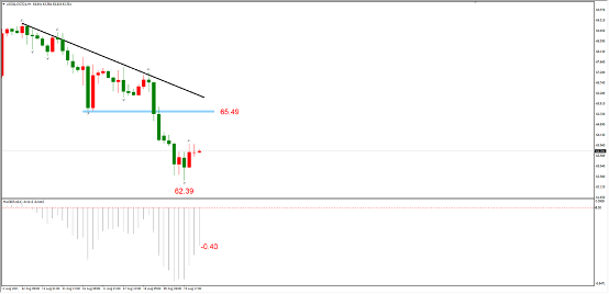 结构上看,10月合约的下降趋势线表现良好,前期支撑位65.49已经被有效跌破。不过,昨日低点62.39有可能成为短期支撑位,今日反弹动能较强。