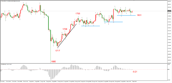 黄金对美元指数的下跌反应平淡,EURUSD在大涨,而黄金维持1800附近震荡,主要原因是8月9日金价跌至1680后反弹过于激烈,甚至出现美美指与黄金出现同涨格局。在金价过度反弹之后,现在就出现了美指下跌而金价不涨的局面。
