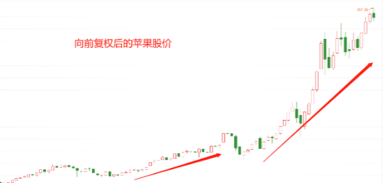 这里只展示苹果公司的股票,因为其它四支个股的走势与其大同小异。当然,图中的股价是经过向前复权后的走势,如果不进行复权的话,会由于两次拆股(1拆7和1拆4)而不易进行分析。