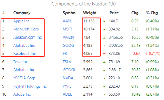 这五家公司正好是我们前面提到的FAAMG,奈非的权重排在11位,占比1.757%,虽然没有这五家企业占比高,但从排名来看,依旧靠前。