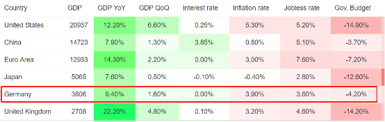 德国失业率仅为3.6%,处于充分就业状态;通胀率3.9%,偏高,但欧央行行长已经将其定性为“低基数效应下的暂时现象”。可以看出,德国的失业率比美国低,通胀率没有美国高,所以其经济潜能要高于现阶段的美国。