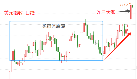 伴随着十年期美债收益率的一步步走高,市场对于美联储即将缩减每月购债的顾虑完全被打消,随之而来的就是,美元指数迅速攀升。昨日,美元指数上涨0.68%,最高触及94.44,以当前的趋势和市场预期来看,预计近期突破95整数关口是大概率事件。