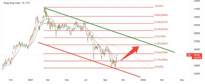 ATFX分析认为, 中美关系展开好进展, 北京政府政策渐见明朗, 有望刺激北水重临港股, 恒生指数有机会展开「中期升浪」。技术上, 恒生指数连续三个交易上升, 升越10天和20天线之上, 利用黄金比例计算反弹, 周一刚到达23.6%, 25466点。若随后一周内, 恒生指数守住10天和20天线继续上升, 将上望上一级黄金比例38.2%阻力, 26562点。展望第四季走势中, 值得期待恒生指数上试下降通道顶部至27000点水平。