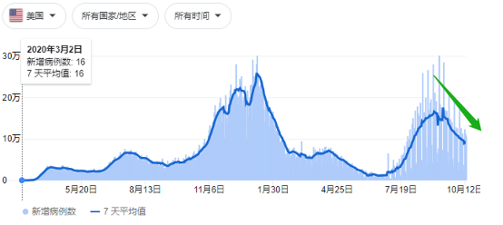 自德尔塔病毒得到有效控制之后,美国的新增确诊人数就开始显著下降。最新的日新增确诊为10万人左右,依旧偏多,但相比巅峰时期的30万人来说,已经出现了相当大程度的好转。