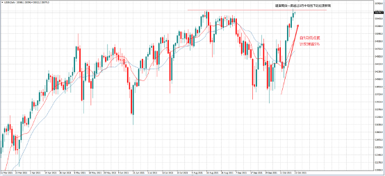 但经济报告没有太过影响美股向上,当前市场正处于第三季财报靓丽的氛围中,自上周以来的美股上涨主要靠企业业绩超预期的拉动。而财报序幕拉开前夕,市场原先担忧供应链问题、利润率压力、薪资上涨以及投入成本上升会影响企业业绩显著放缓。