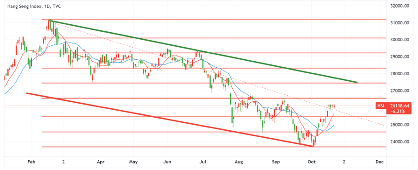 ATFX分析恒生指数走势认为, 本周环球市场观望美国公布三季国内生产总值及PCE物价指数表现, 并且关注即将公布的苹果、脸书及亚马逊等多家互联网和数码巨头财报, 若强劲的财报表现有望提振近期落后的大型科网股, 如腾讯(HK.0700)及百度集团(HK9888)的股价, 并且有可能刺激其他新经济股如快手(HK1022)股价。如以上相关的股票价格上升动力增加, 恒生指数可望再度向上测试26555点。技术上, 近两周恒生指数表现强劲, 料可保持10天和20天线之上发展, 短期若恒生指数上望26555点后突破该位, 将上望绿色线顶部目标27448点。