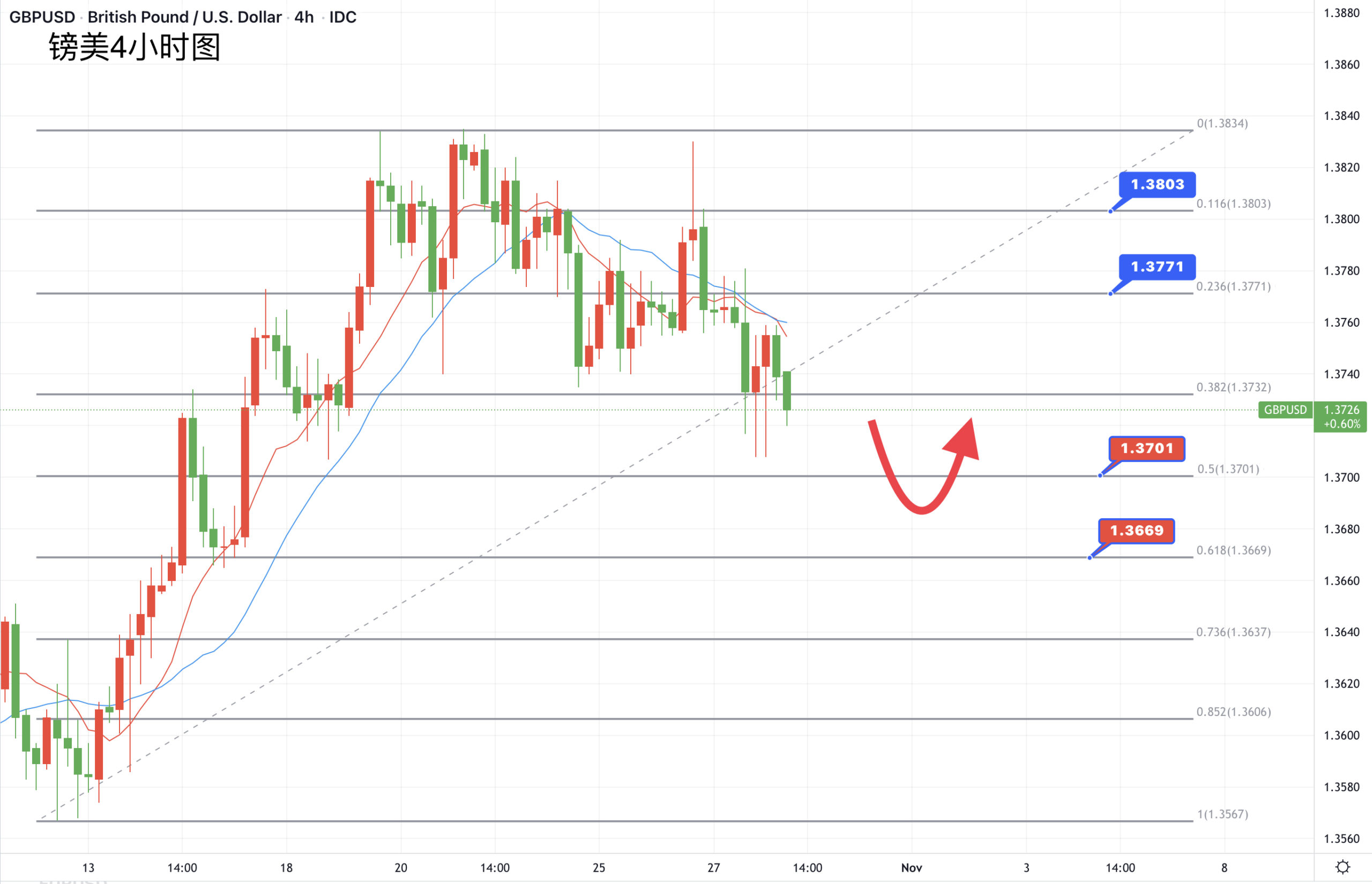 英镑兑美元昨日震荡下行,盘中测试10日最低位,技术上留意承压信号跟进,在跌破10日均线之后曾靠近1.3700关口,今日欧央行决议可能带来间接指引,因市场仍积极预期英国央行不久后采取加息,如果欧央行鸽派展望将体现政策对比给英镑带来支撑,有机会上望1.3800上方阻力。