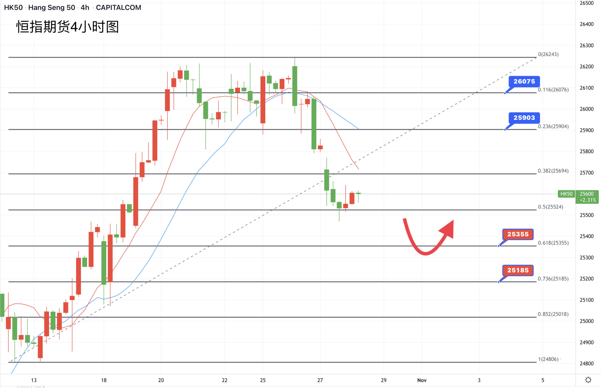 HK50昨日低开低走收于七个交易日最低,10日均线转为了阻力后,今早走势偏向承压暂时关注25600下方的水平,如果能在昨日低位处获得支撑,那么可能反弹回到25800之上重新测试均线阻力。