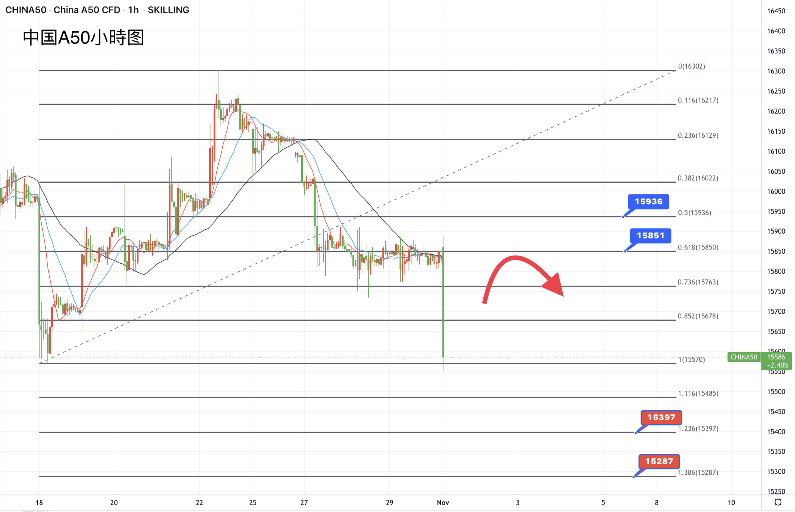 CHI50上周连续两日基本收平,位于日图两大均线之间的窄幅区间内,但今早低走下破支撑水平,目前位于10月中旬以来的低位附近考验的是15500的支撑位,一旦跌破将打开更低下行空间,如果受支撑则有机会反弹。