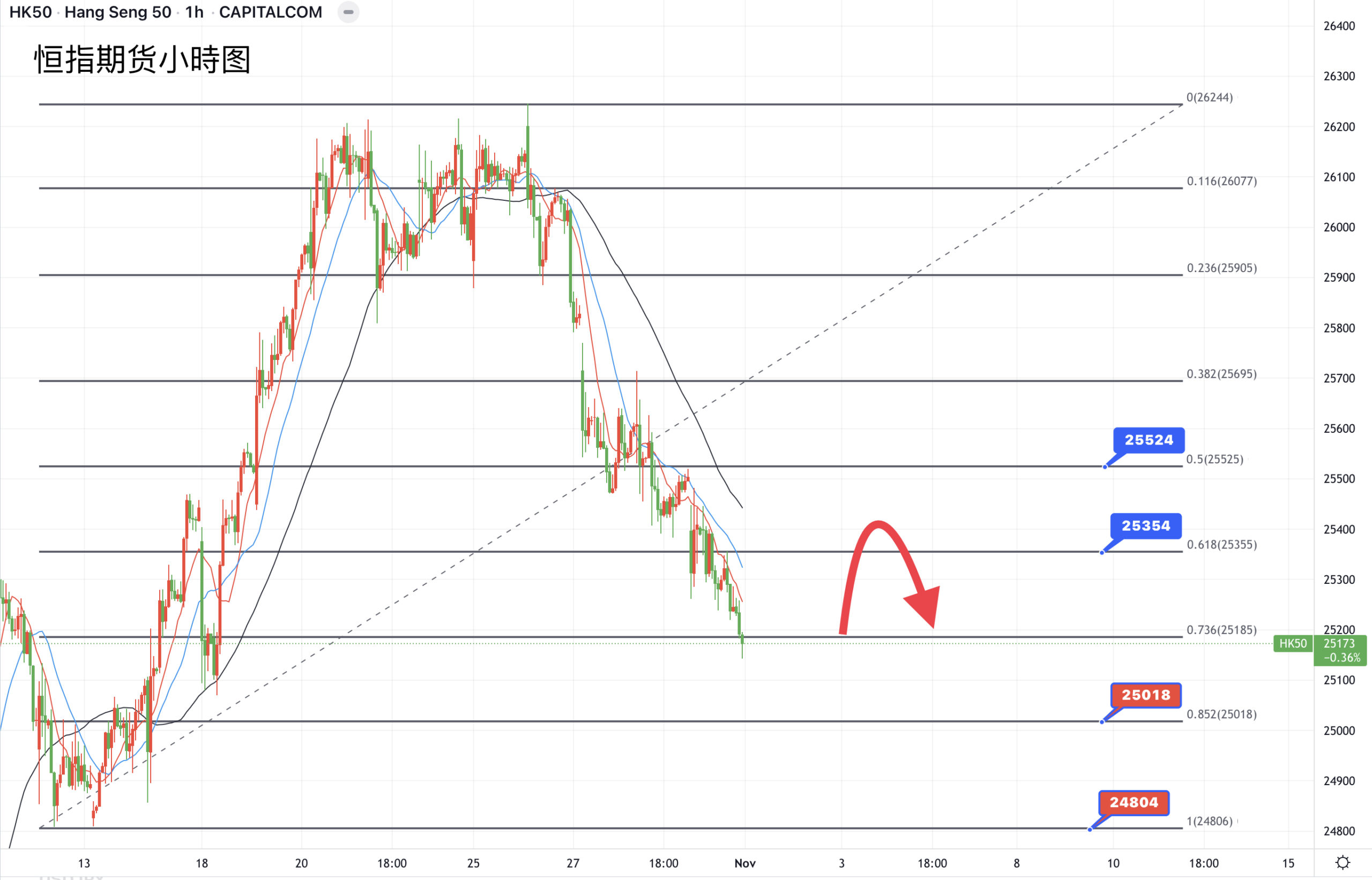 HK50上周五收于近两周的最低位,正好收在20日均线处,所以在该位寻找支撑,但今早继续走低,已经是连续五日向下,如果继续下探低位,意味着25000下方可能被触及。