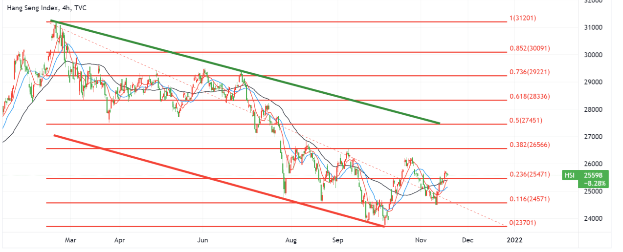大市走势分面, ATFX分析认为恒指指数走势有机会调整过去五个交易日的升幅。留意下图恒生指数4小时图中其10和50平均线的位置25470, 若突破该支撑位后突破25000关口,下一目标将在24566关键支撑。相反, 若恒生指数突破25800阻力位后持续上升, 将有望向上至26000至26562。