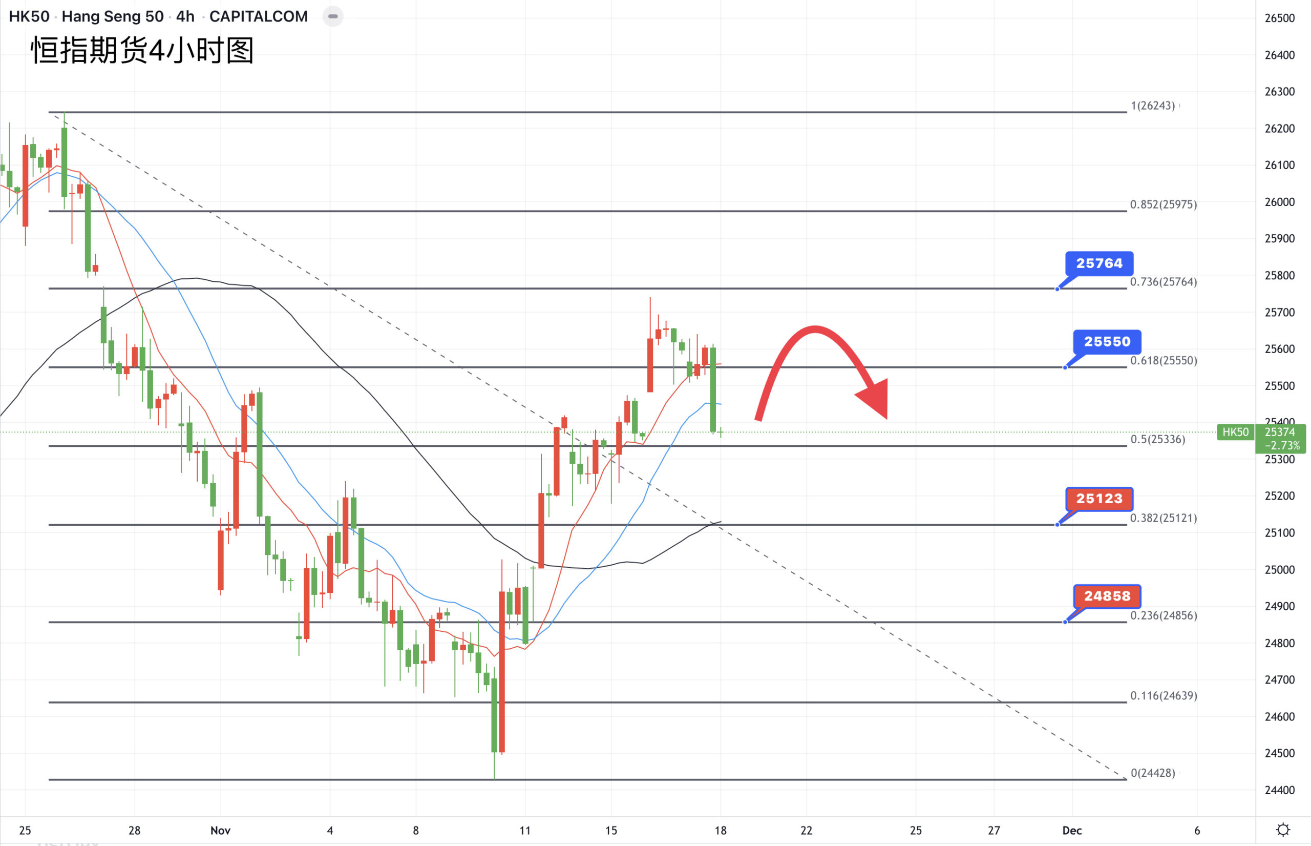 HK50昨日也自近三周以来的高位回落,在25600上方遇阻后收跌,今早测试20日均线的支撑,看能否守在改位之上,若跌破则留意10日均线的支撑将进入视线,一旦跌破意味着重新靠近25000关口。