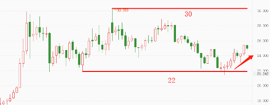 中期来看,白银在触及22元支撑后开启反弹,但整体处于震荡区间之内(22~30)。技术面保持震荡偏多的观点,预计会在30附近遇阻回落。