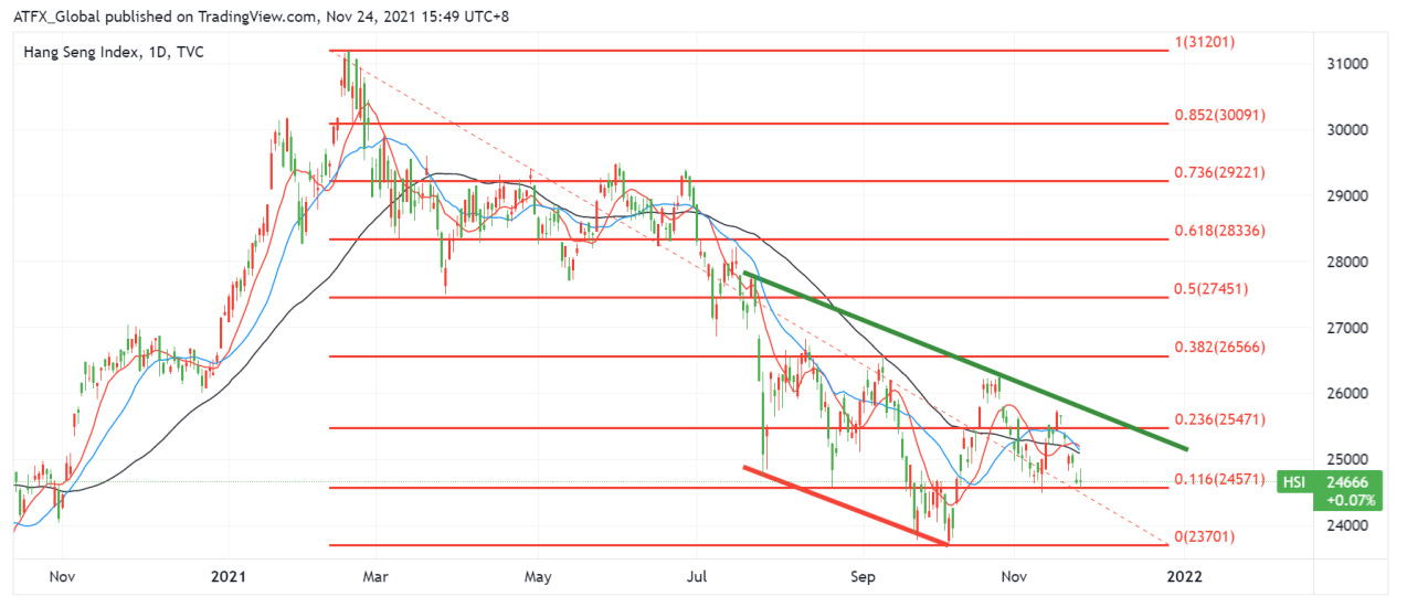 ATFX分析认为整体恒生指数仍然处于好淡争持格局,重要支撑位24571不容有失。一旦突破,恒生指数技术性利淡讯号更加明显, 估计走势有机会在突破24571支撑后下试之阱低位23701。寄往周三晚美国公布的一系列通胀, 经济和就业数据表现进步, 加上美国周末长假期内的黑色星期五消费大日子即将来临, 可望推高美国三大指数同时为周四港股拉升带来空间。