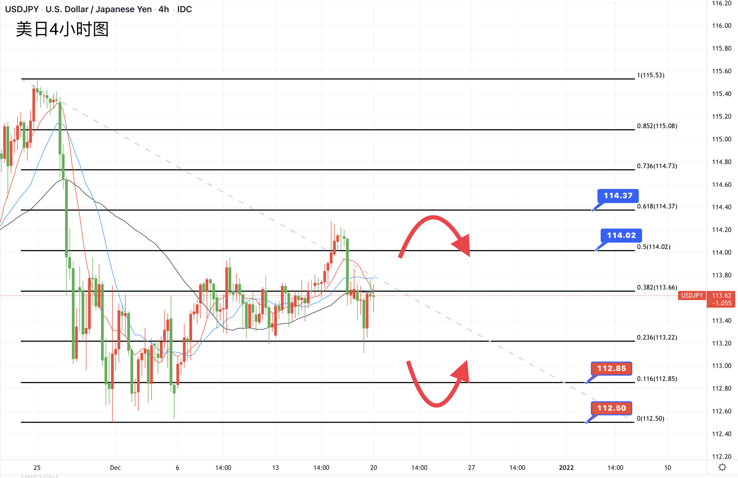 由于担心欧洲地区会实施更多的防疫限制,欧元兑美元上周五创11月10日以来的最大跌幅,技术上日图均线转为了阻力,汇价接近12月低位的支撑范围,一旦进入1.12关口下方,11月低点1.1186也会进入视线。