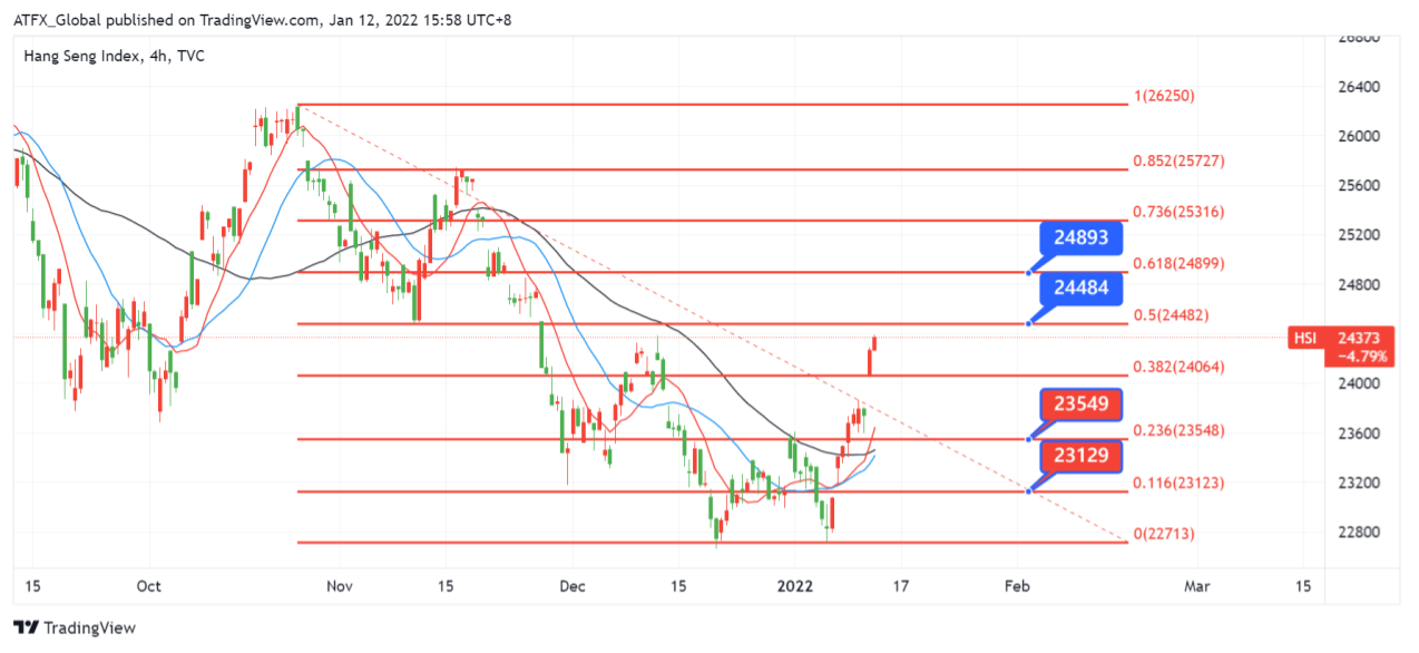 ATFX分析总结, 周三港股借助多重好消息突破24080重要阻力大关后形成双底反弹突破前高, 表现强势回归。在4小时图中, 恒生指数突破反弹浪的38.2%, 指向50%反弹幅度。多条均线在下方提供支撑并指向上方。 若周四及周五, 恒生指数可以继续上升并突破24484, 将看上一级阻力位24893。相反,若恒生指数失去上升动力回落, 首要支撑位留意是24064, 如突破将会测试23548及23129。 (如下图)。