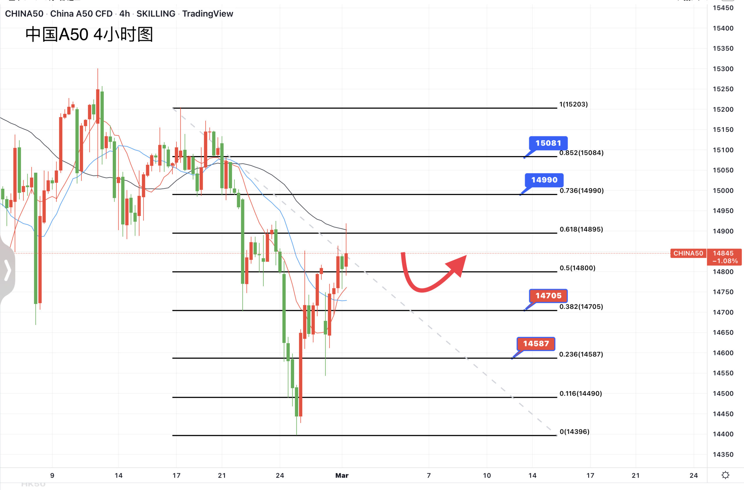 CHI50昨日探底之后尾盘转为回升,今早也延续了升势,日内公布中国最新制造业PMI高于预期回到扩张状态,外围市场情绪也有缓和,价格回到14800之上后看的是10日均线阻力。