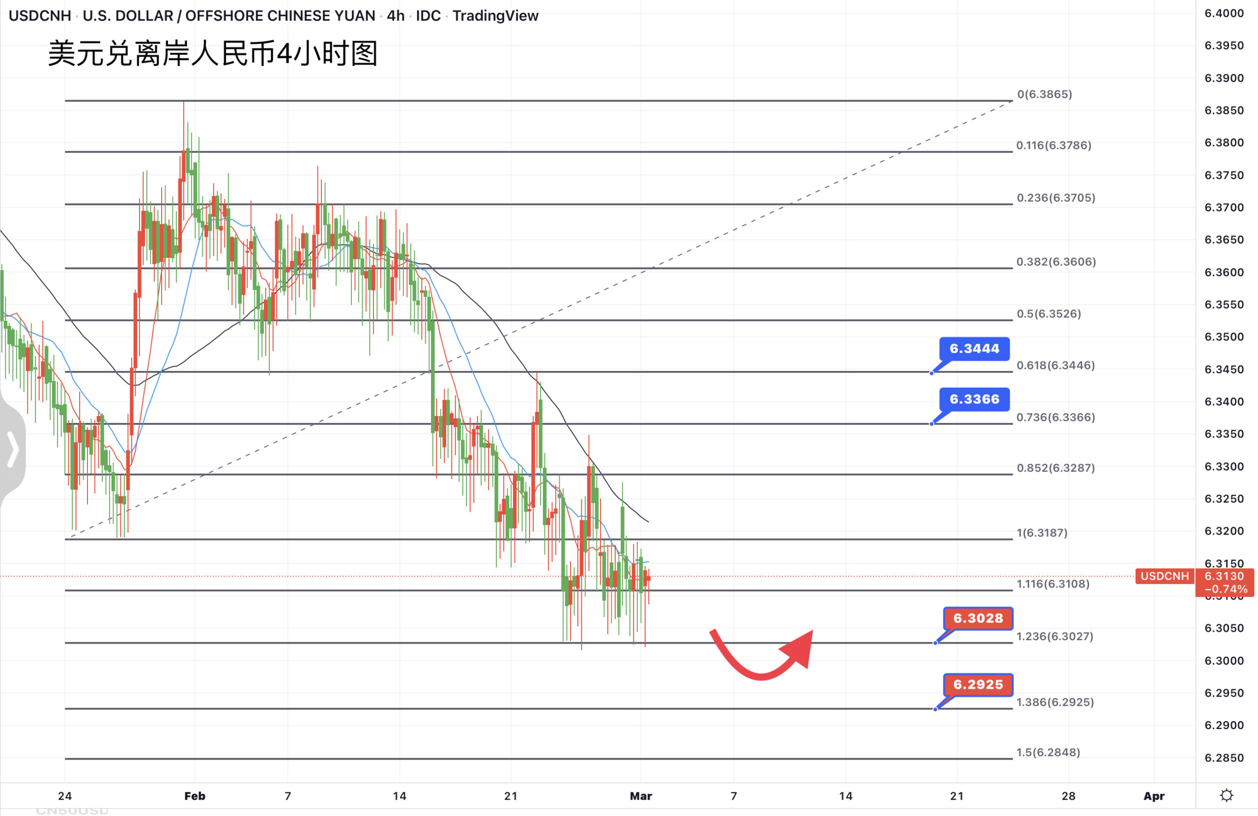 今早公布中国2月官方制造业优于预期录得扩张,昨日人民币即期汇率创近四年新高,美元兑人民币最终录得两连跌,10日均线再次充当阻力,汇价维持在近期的低区间范围,看是否守住6.30水平。