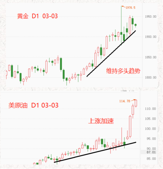 行情走势:俄乌冲突对黄金价格的影响主要集中在2月24日(战争爆发)和3月1日(核战备状态),其它时间里黄金均以阴线收盘。原油则不同,在经过2月24日~28日的震荡后,自3月1日开启,油价迅猛上涨,最高已经触及112美元/桶,使其成为俄乌冲突期间最适宜交易的品种。早在2月24日的文章中我们就提到:“俄乌冲突结束后,黄金大概率开启深度回调,因为美联储加息政策并不支持黄金多头走势。与黄金不同,即便俄乌冲突结束,原油价格也将维持强势表现,因为OPEC+的增产复苏依旧不足。”当下的黄金和原油走势,恰好验证了当初的预测。