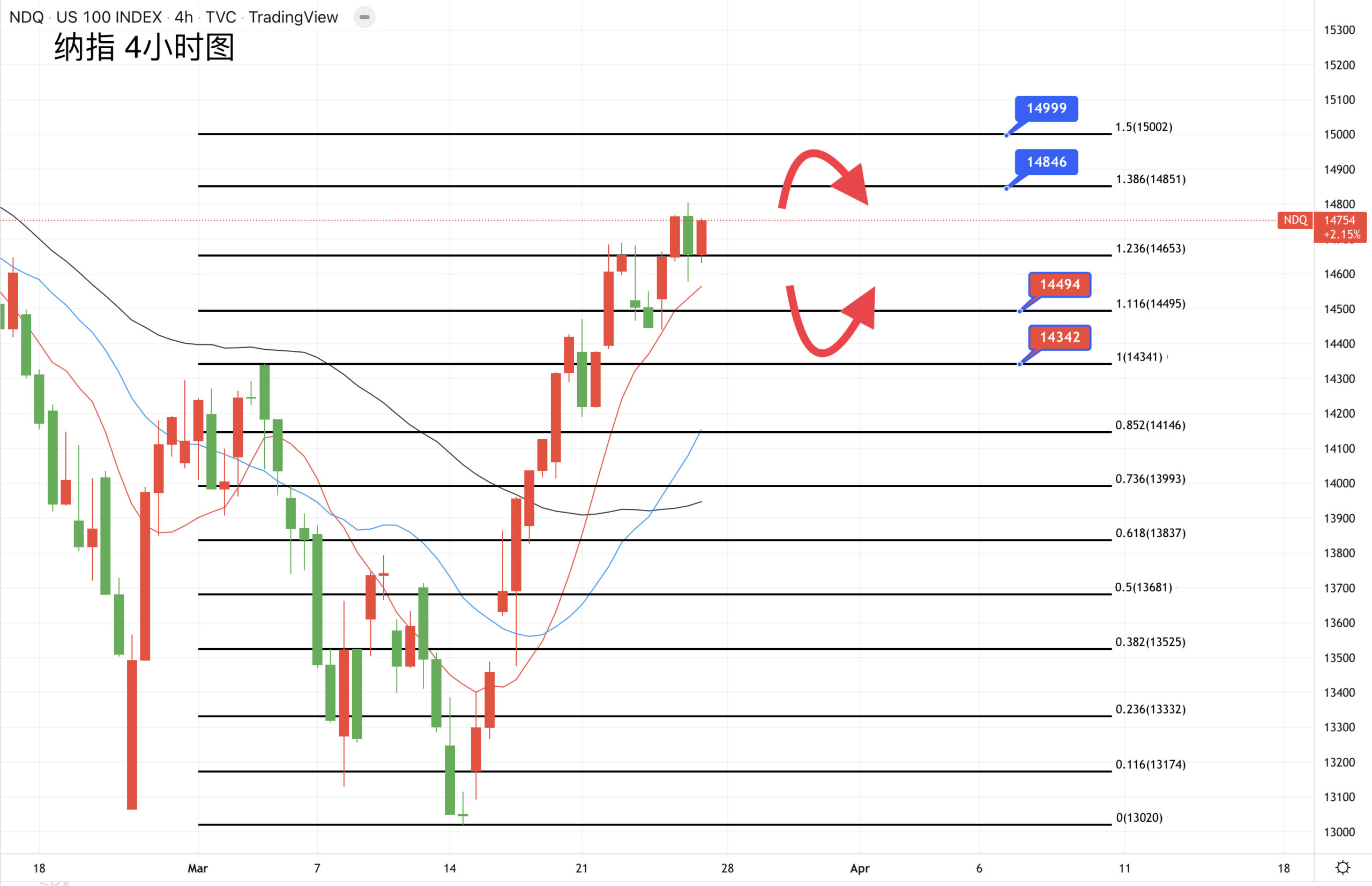 投资者正在评估美联储在收紧政策时将采取多大力度的同时,市场风险偏好得以维持,上周五道指盘中触及2月17日以来的最高位34960,不过今早出现回吐,今日美国数据指引有限,重点看俄乌谈判,决定道指升势能否扩大至35000关口。