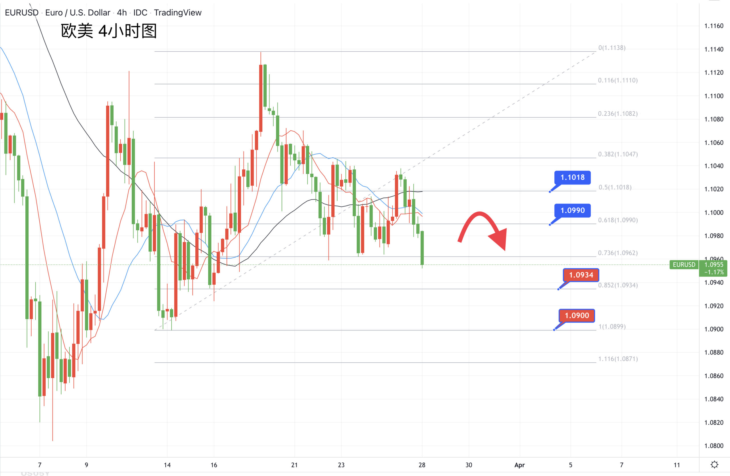 欧元兑美元在1.10下方维持承压,今早延续前三日的下跌,相比起美联储鹰调强劲,欧央行步调更显落后,技术上逾一周的下行趋势还在扩展,如果跌破上周的低位,则空间将下望至靠近1.09水平。