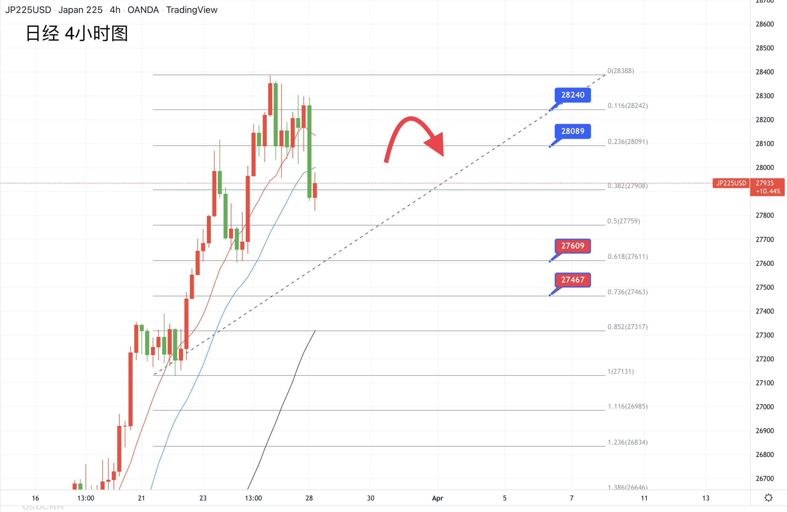 日经225指数上周五自高位回落后,今早进一步走低并跌破28000关口,目前除了市场情绪指引外,技术上可先看27600附近的支撑,如果跌破27500则意味着前期升势的正式扭转。