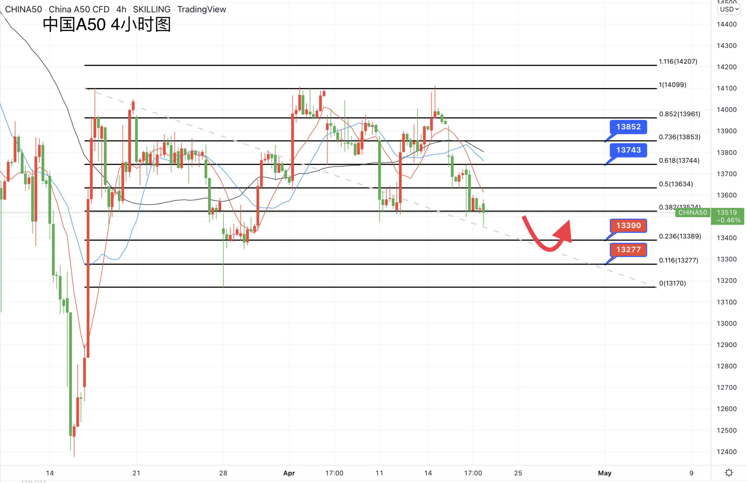 A50指数缺乏利多指引已经连续四日收低,今早盘中一度触及3月底以来最低位,跌破13500水平,如果日内未能收复该位,则技术上弱势可能加剧至13387/13310低位范围。