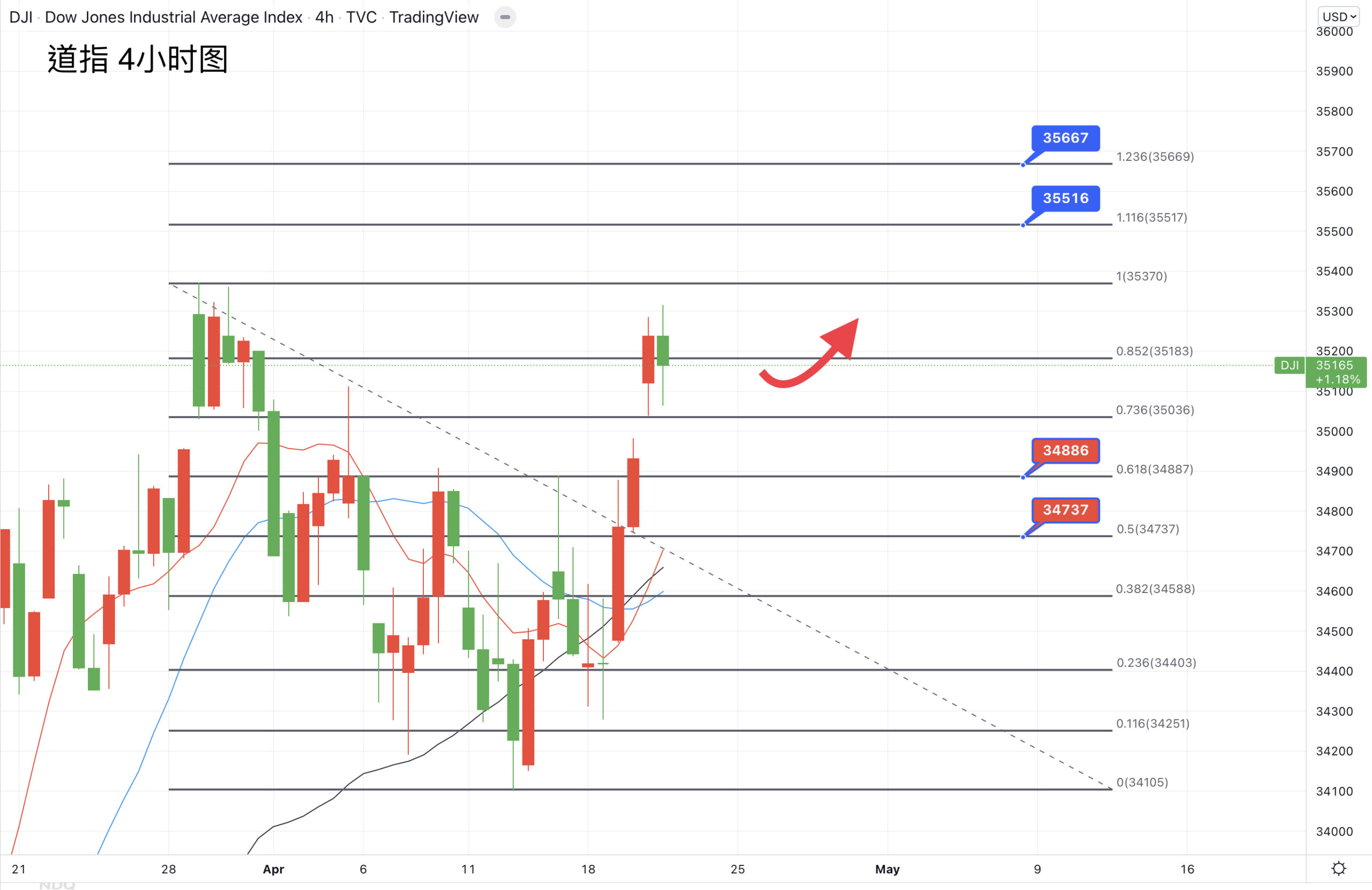 道指连续两日反弹,昨日触及了3月底以来的最高位,技术上逼近前高范围表明需要留意阻力,尤其是在35400处,如果测试后无功而返或意味近期的升幅将调整,如果有机会突破则上望35500上方。