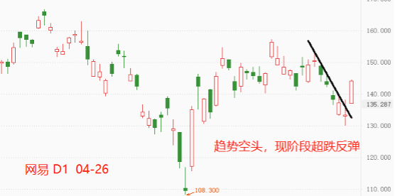 行情面:受超跌反弹情绪影响,港股市场新能源车、互联网板块大涨。千亿市值以上的上市公司中,京东集团、小鹏汽车、京东健康三只个股位列涨幅榜前三,涨幅介于(8.5%~9.2%)之间。网易排在第七位,涨幅达到7.65%,最高触及144.5港元。网易的长周期走势特征为震荡,三月份刚刚触及上市以来最低点108.3,当下处于由震荡区间底部向顶部的运动过程中。短期目标位在4月4日高点157,只有该高点被有效突破,我们才能认为当下的超跌反弹发展成了可靠的上涨趋势。在突破之前,维持短期交易思路,不建议做长期持有打算。