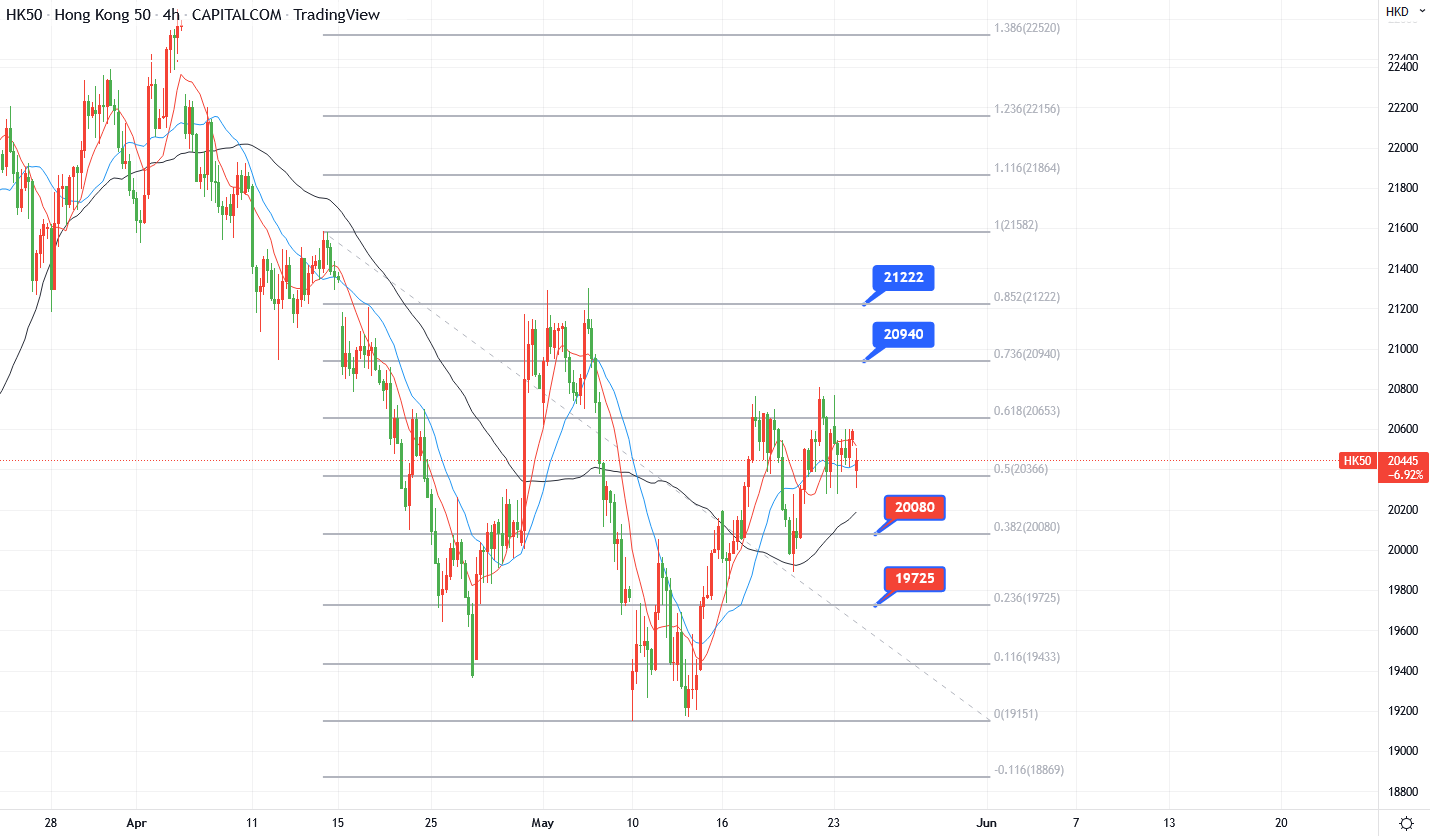 HK50连续两日收跌后今早低开但有买盘承接,当前可以看20500附近为主要交投范围,因为该位附近集合了两大均线,是决定短线走势的关键,另外则看内地股市能否缓和早段跌势。