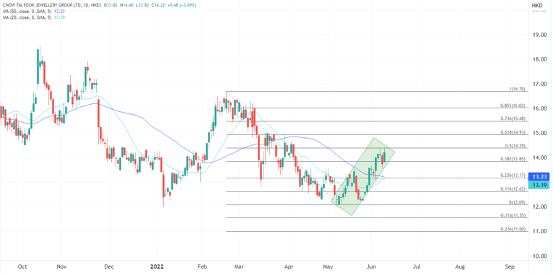 ATFX认为,随着疫情减退后内地和香港零售市道逐渐恢复,香港4月零售销售额已见大幅反弹,内地市场在6月份预计加速修复,周大福前两个月同店销售下跌的情况有望改善,而其股价近两周也跟随消费类股回暖,本月已经累计上涨逾5%,最新宣布的股价回购也有利于市场信心。