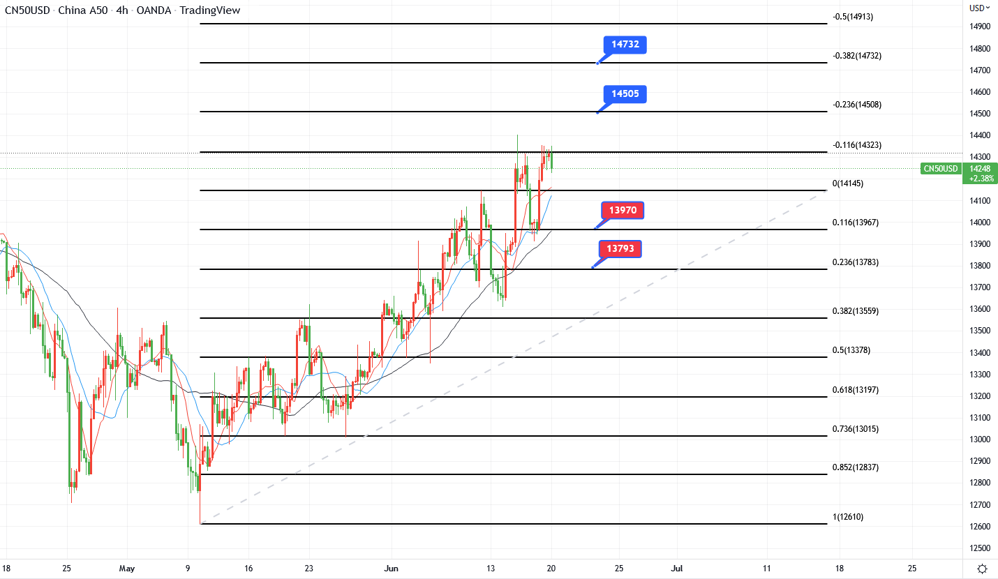 A50指数上周五明显反弹但在上周高位范围暂时止步,今早继续在其附近盘整,表明多头想再试突破,所以14400会是升势能否推进的关键,如果再次遇阻的话应留意向4小时10均线所在的14145靠近。
